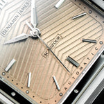 The crisp chevron motif embossed into the dial adds visual depth, meanwhile the circular grained finish on top gives the colours of the dial a metallic sunburst effect and look dramatically different under different angles of light.