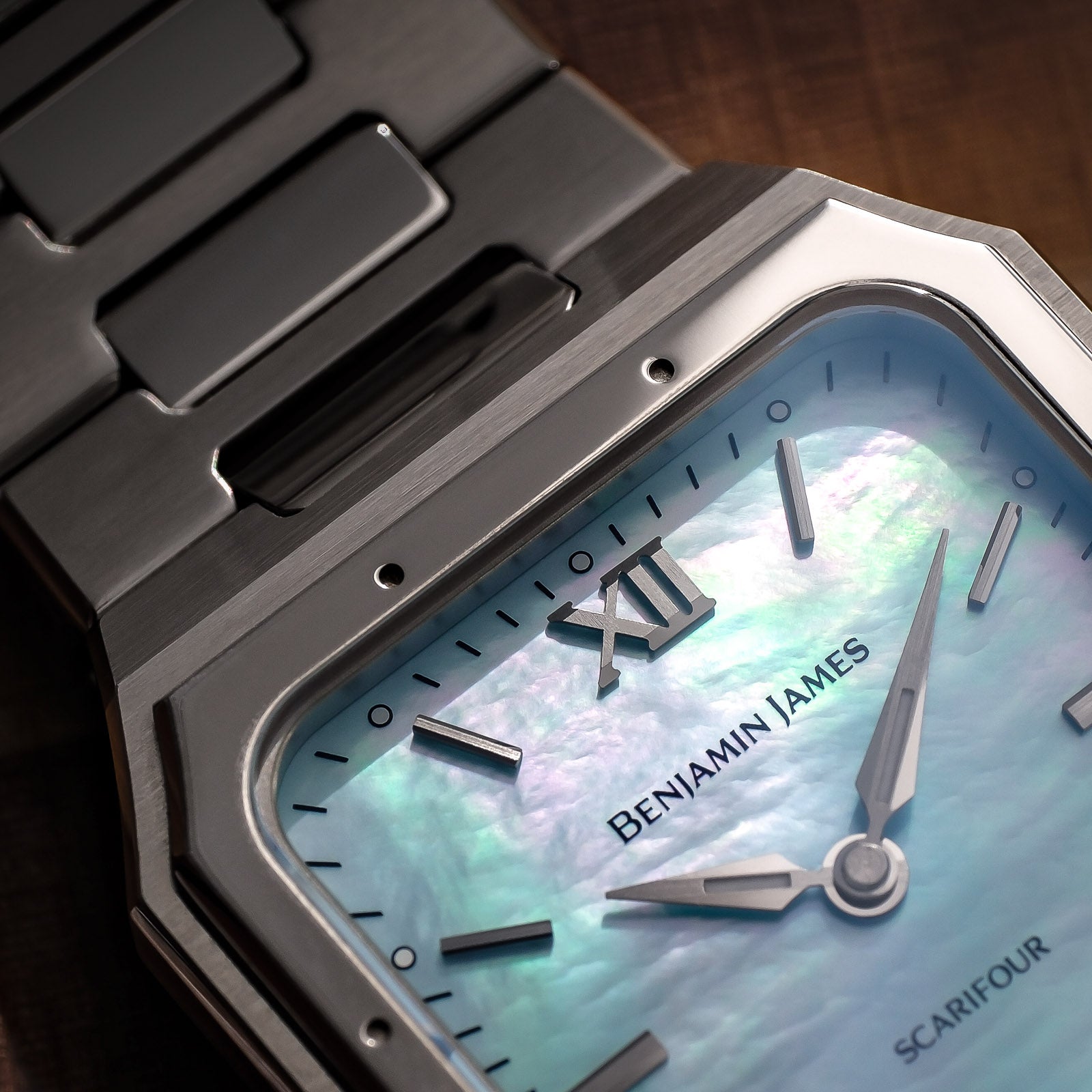 A striking limited production version of the Scarifour is here. This addition to our classic collection pairs the Scarifour’s signature proportions with a captivating ice blue mother of pearl dial.