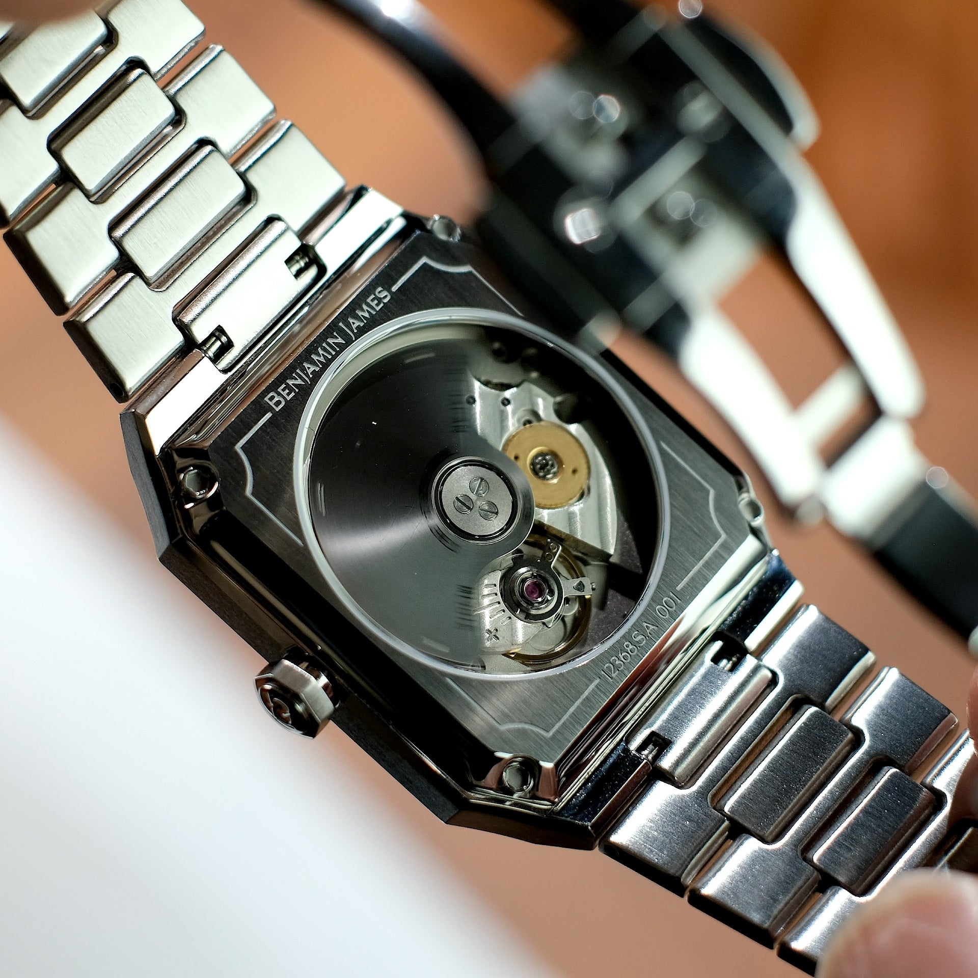 This movement is exceptionally thin coming in at only 3.9mm and is a true non-date movement with low hand stack. Using this movement helped us to retain a sleek case thickness of 9.5mm.