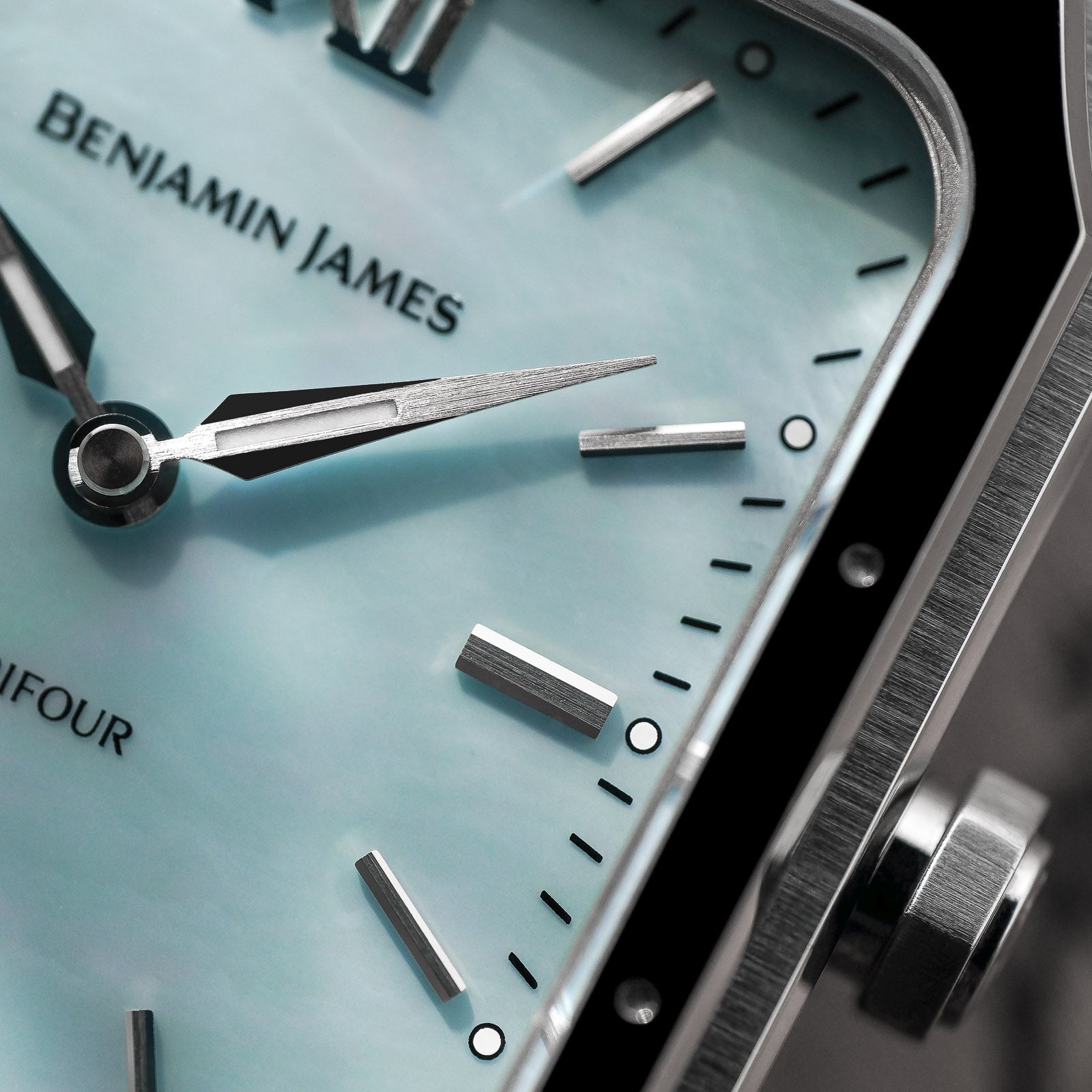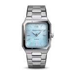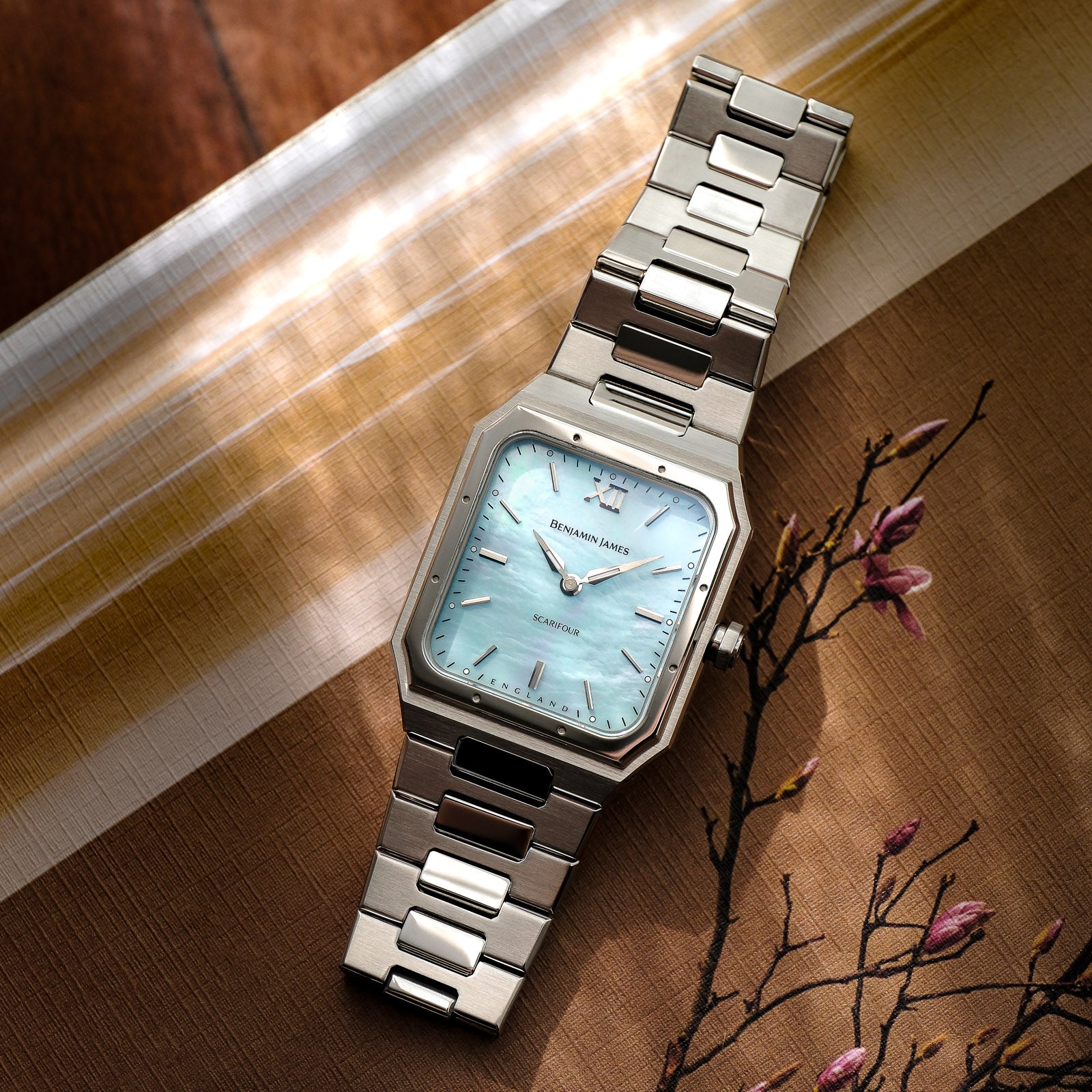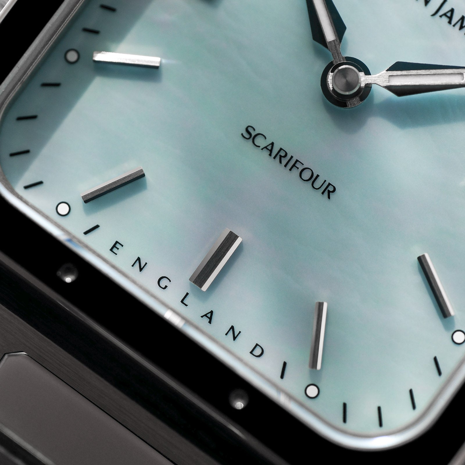 A striking limited production version of the Scarifour is here. This addition to our classic collection pairs the Scarifour’s signature proportions with a captivating ice blue mother of pearl dial.