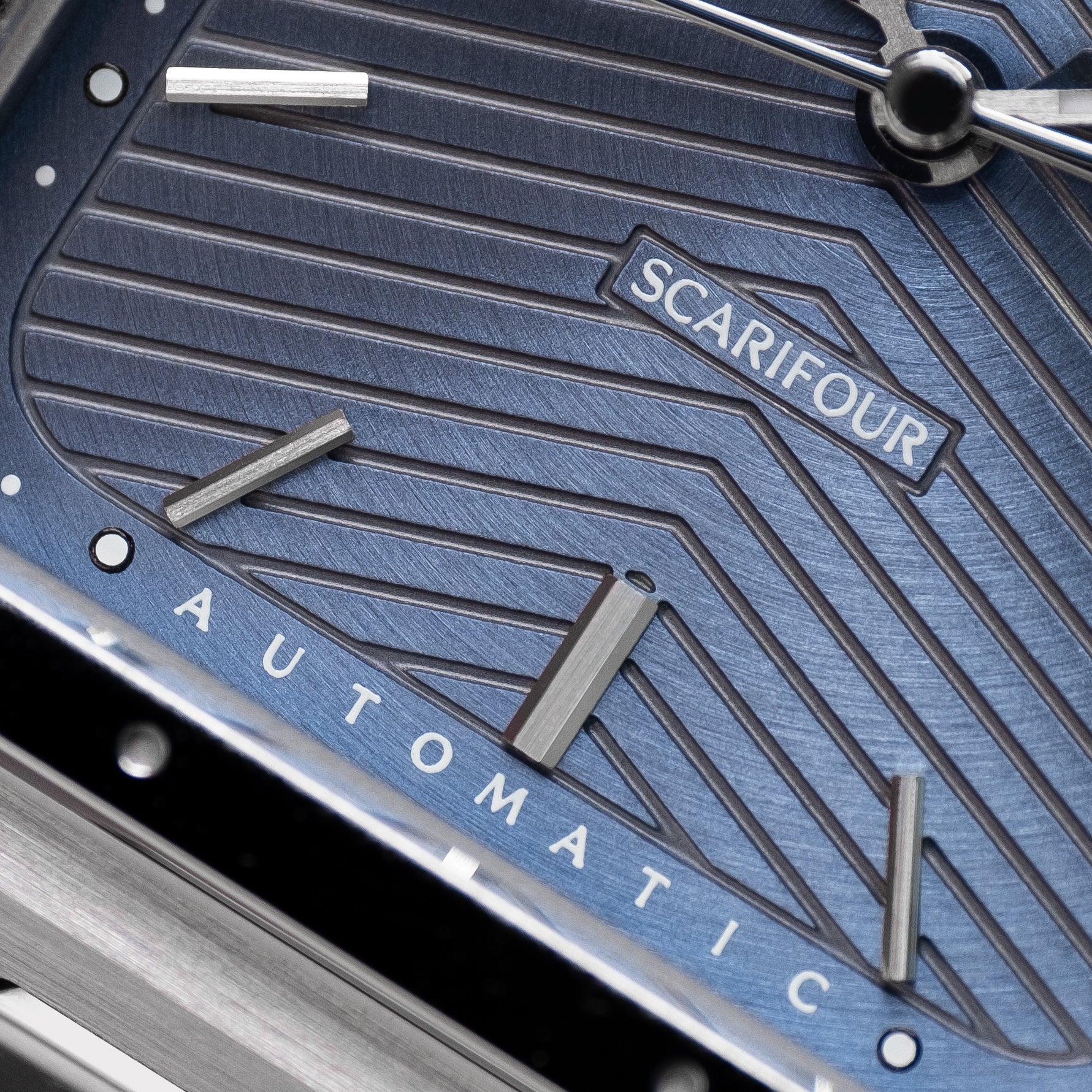 The dial on the Scarifour range is known as a ‘Heraldry Dial’ since the shape of the embossing is inspired by the chevron found on the Coat of Arms of Cheltenham - our founders local town growing up.