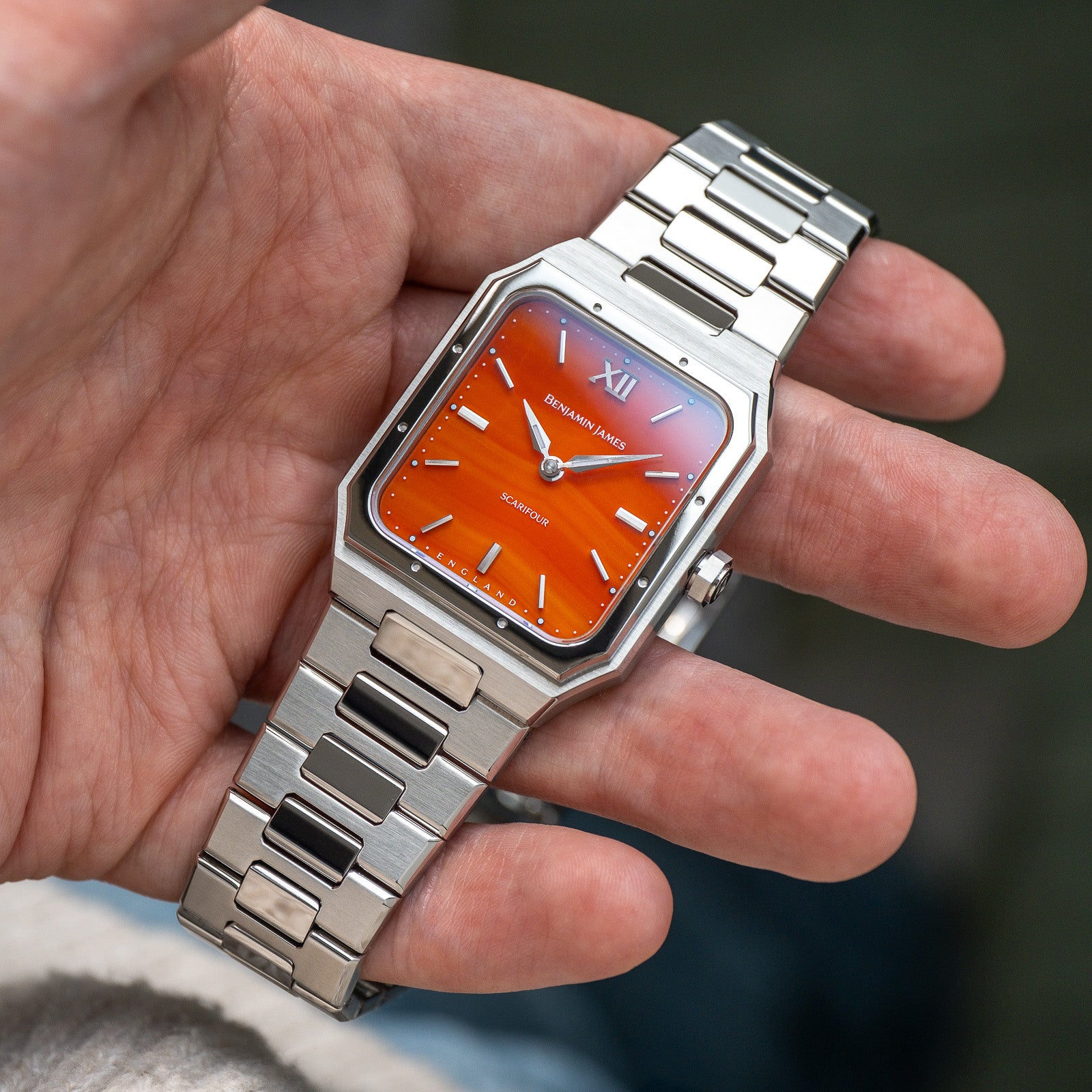 Scarifour 腕表的限量版惊艳亮相。这款腕表是我们经典系列的全新成员,将 Scarifour 腕表标志性的表盘比例与迷人的天然玛瑙石表盘完美融合。