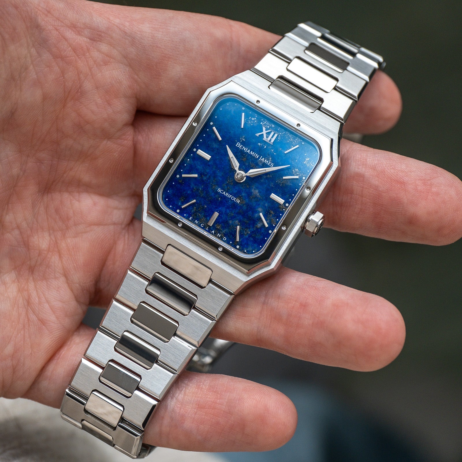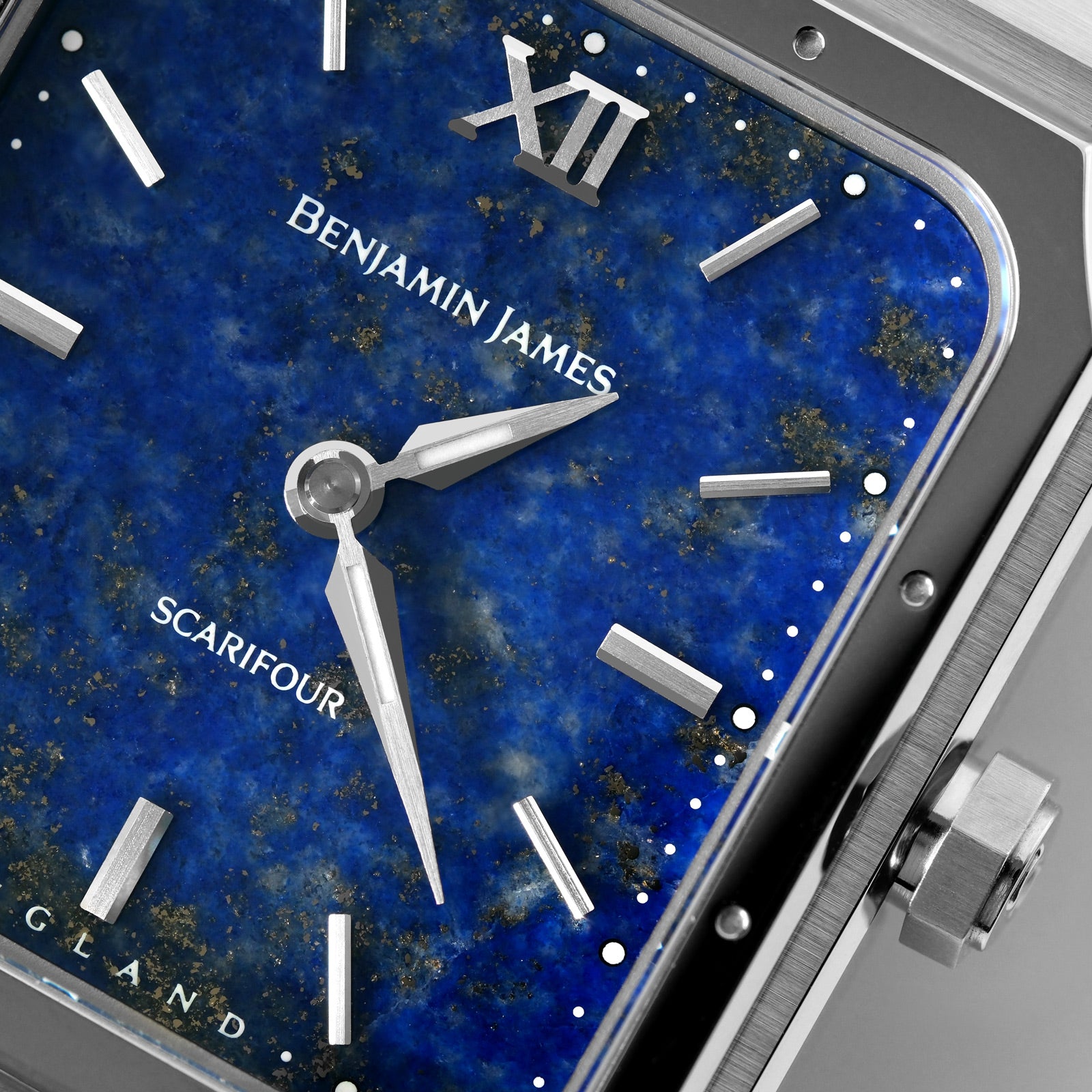 Scarifour 腕表的限量版惊艳亮相。这款腕表是我们经典系列的全新成员,将 Scarifour 腕表标志性的比例与迷人的天然青金石表盘完美融合。